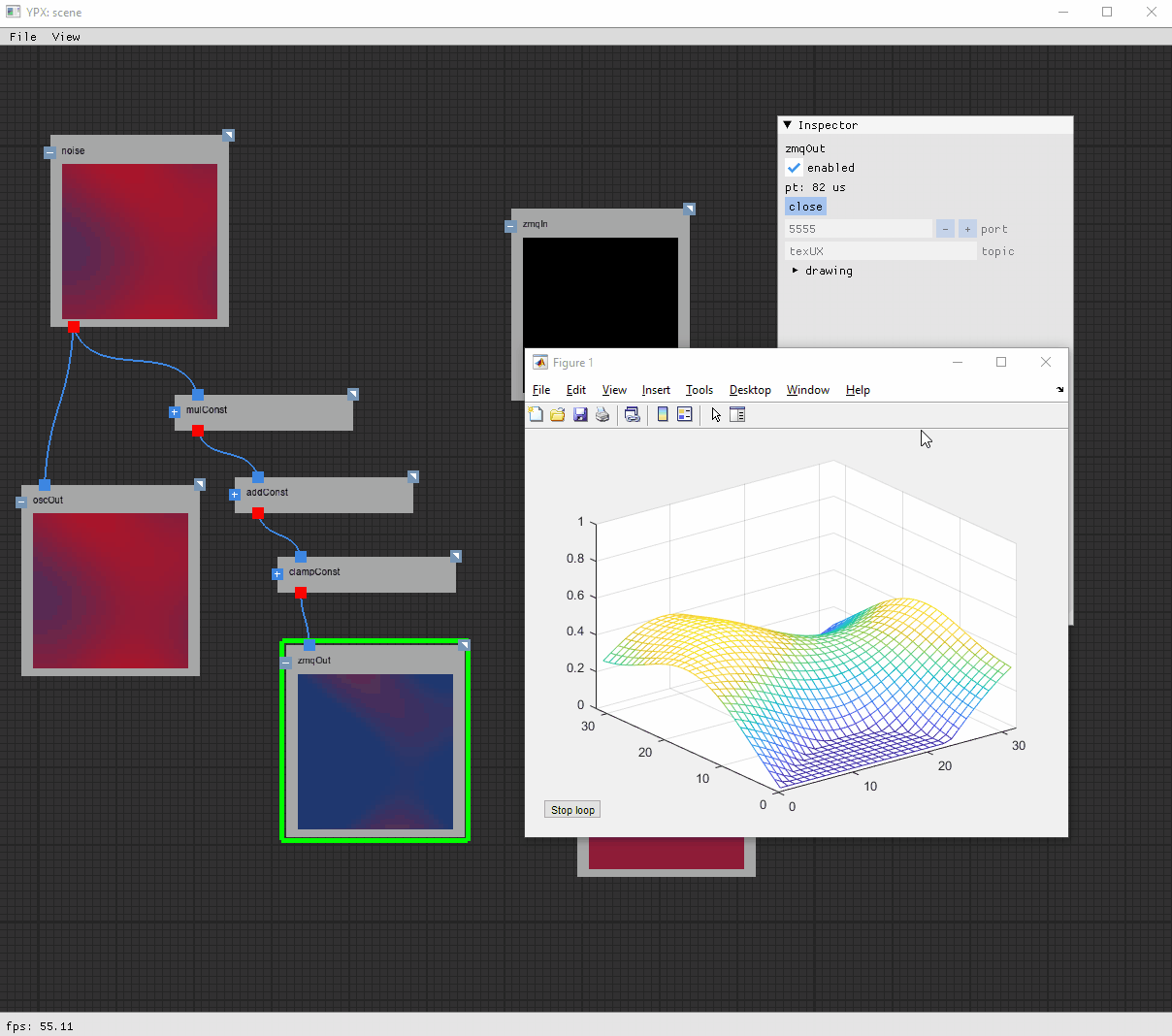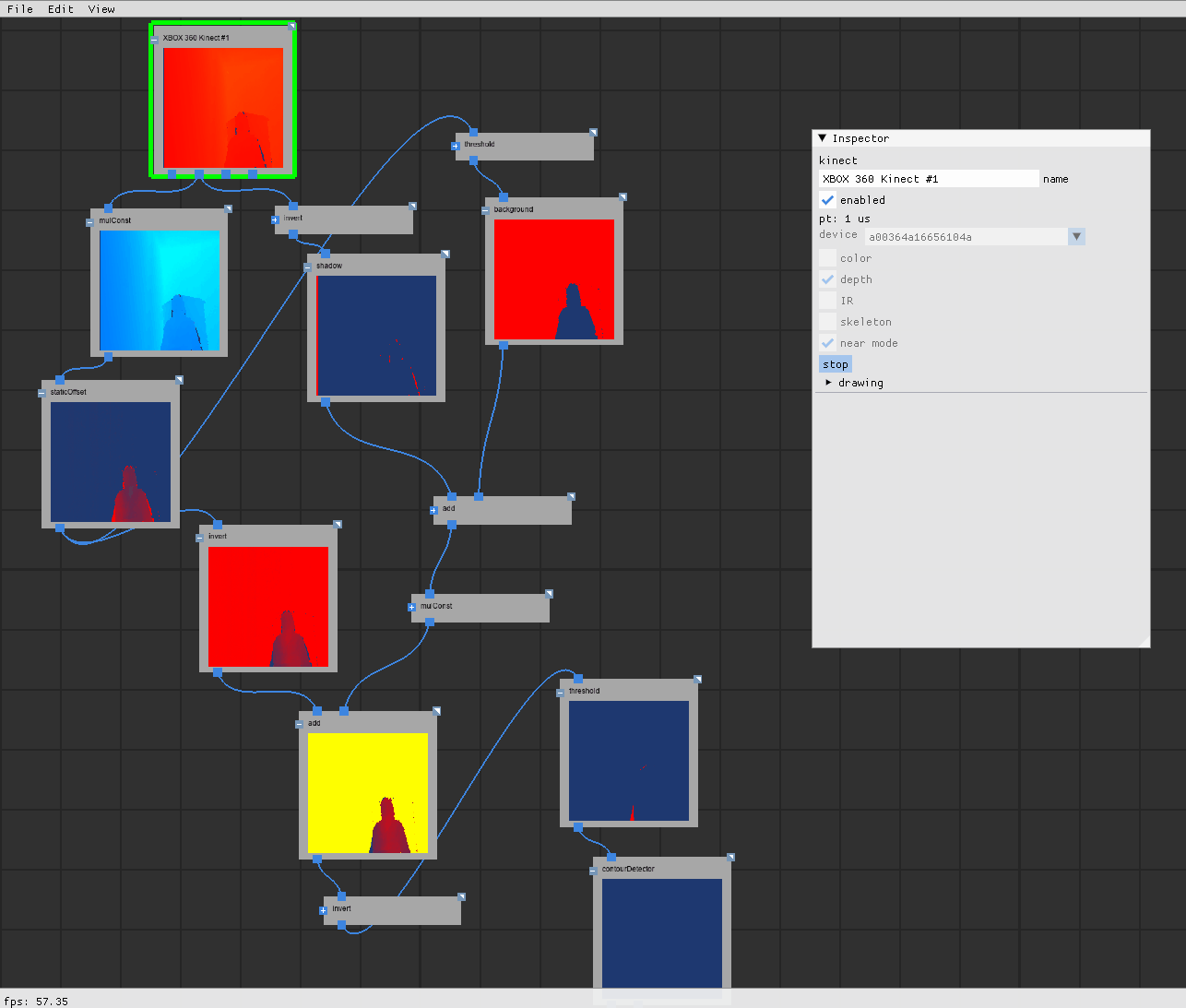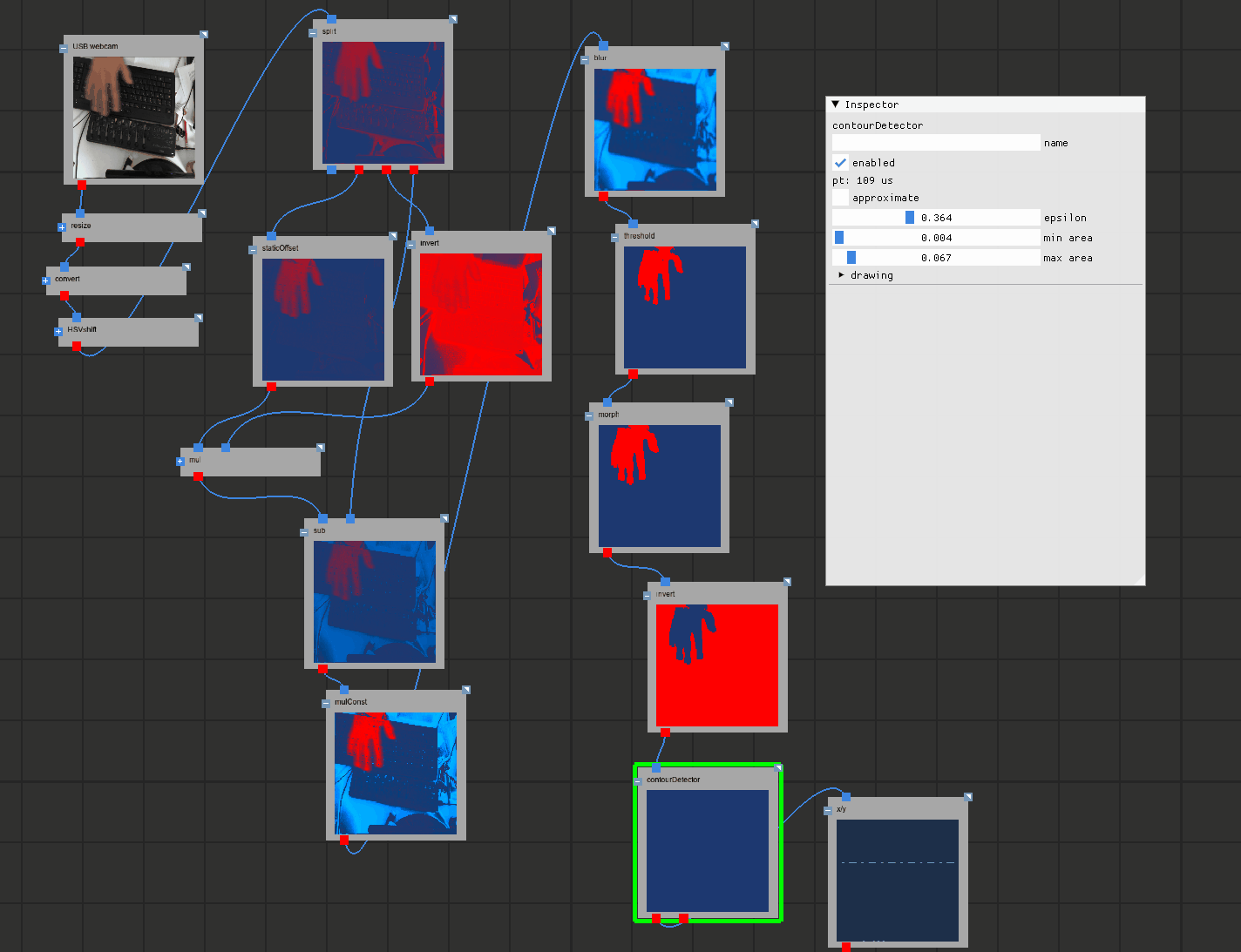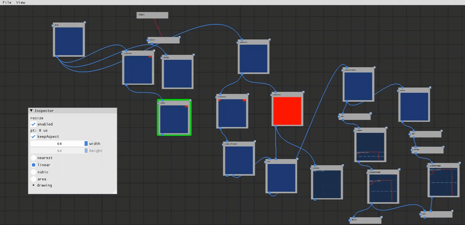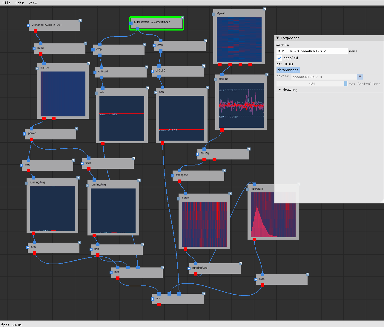 sqıd is meant as a lens that enables to zoom into the data processing aspects (i.e., setting up and tuning) of a pipeline, including small-scale as well as rather complex setups. The GUI is heavily inspired by well-known and widespread VP based patching tools such as Max/MSP, Puredata, vvvv, TouchDesigner, etc., also borrowing some of their terminology. The user may set up directed graphs by instantiating filter nodes (“Operators”) and by configuring respective parameters and instantly see the effects at integrated live data visualizations. Existing Operators include basic algebraic operations, mathematic operations such as FFT, low- and high-pass filters, matrix rearrangements, color space conversions, logical operations, and much more.