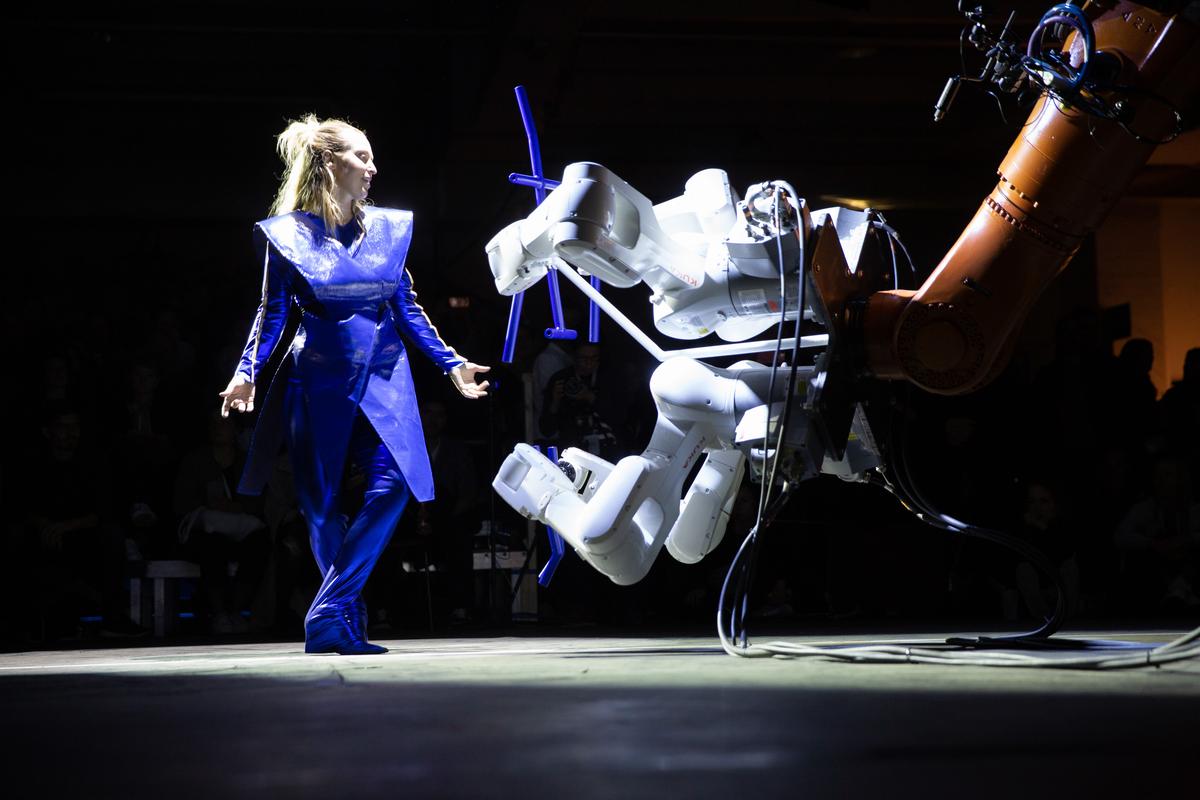Underbody is a 15-minute dance performance by Silke Grabinger (AT, choreographer and dancer) in cooperation with Johannes Braumann (UFG Linz) and the Ars Electronica Futurelab, premiered at the Big Concert Night of the Ars Electronica Festival 2019. It is based on Gertrud Bodenwieser’s play “Dämon Maschine” (1923), where five dancers turn into one machine. Contrarily here, one “dancer” is portraited by five machines, i.e. by five industrial KUKA industrial robot arms.